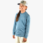 The Youth Samurai Hooded Long Sleeve Performance Tee provides more stretch and is a bit roomier than the Samurai 1. Along with UPF 50 sun protection, and moisture wicking material with stain resistance this will be perfect for your kid Angler to get on the water and you can be assured that they will be comfortable long enough to get hooked.