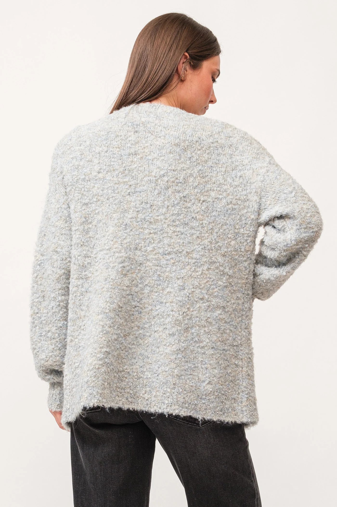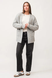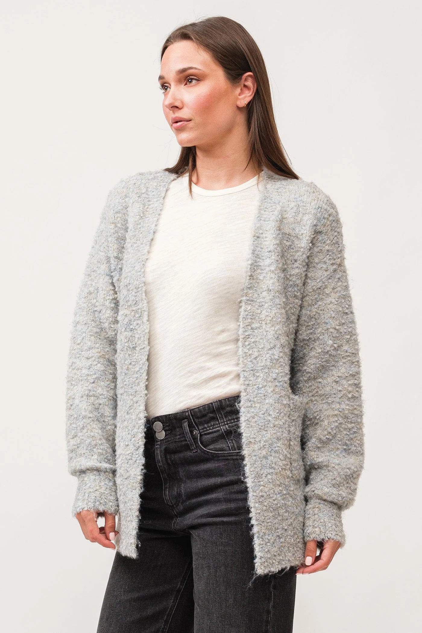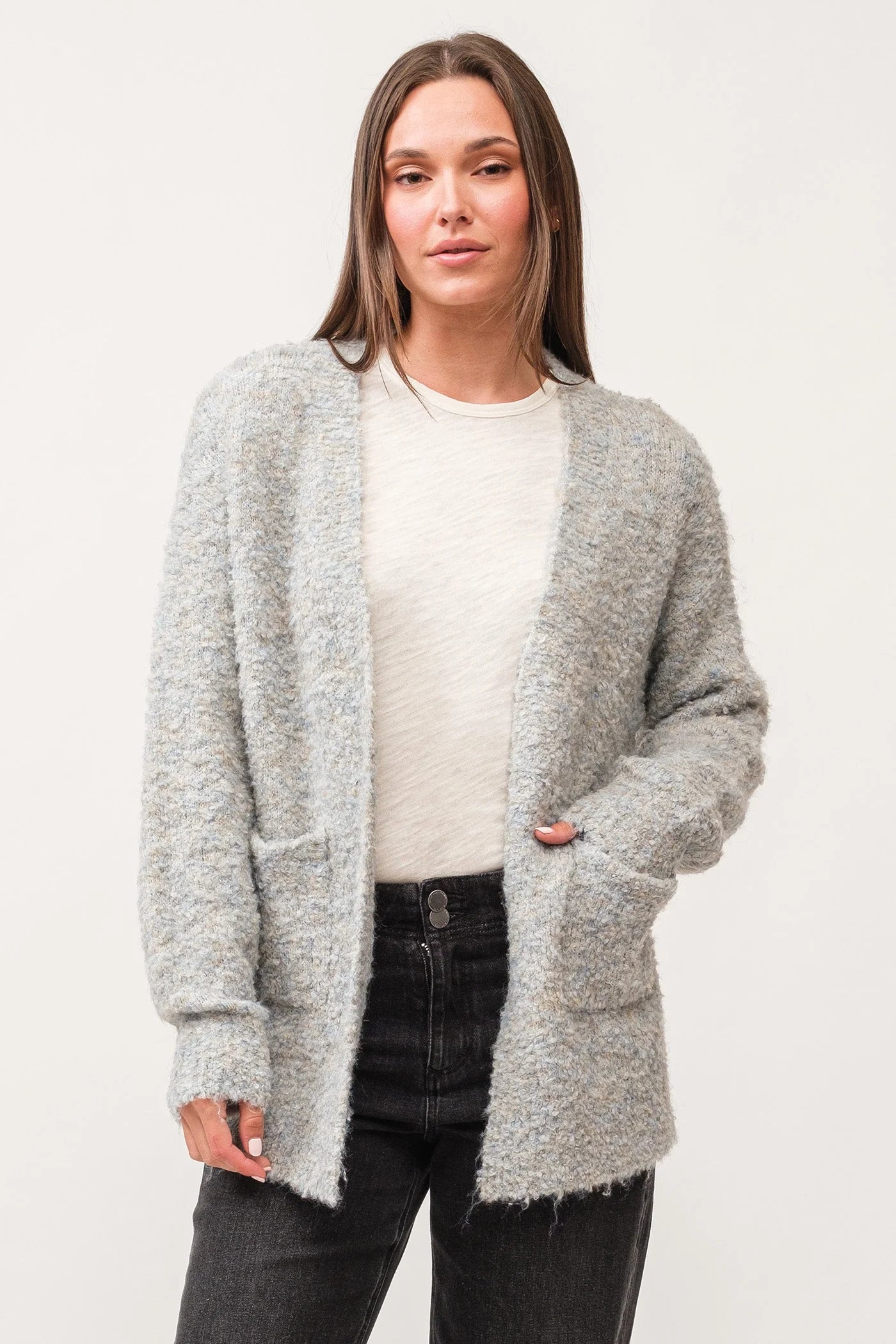 Long sleeve relaxed fit cardigan in unique boucle yarn. Crafted for comfort and style, this piece offers a timeless silhouette with a modern twist. Perfect for to keep warm & cozy with patch pocket, it seamlessly adapts to any lifestyle. Elevate your wardrobe with this fuzzy yet chic staple.