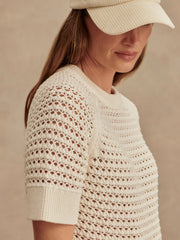Designed for comfort and style, this breathable knit tee pairs effortlessly with our soft twill shorts and pants. Experience contemporary charm with its intricate crochet detailing and versatile crew neck design.