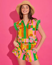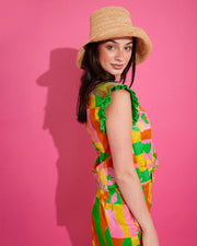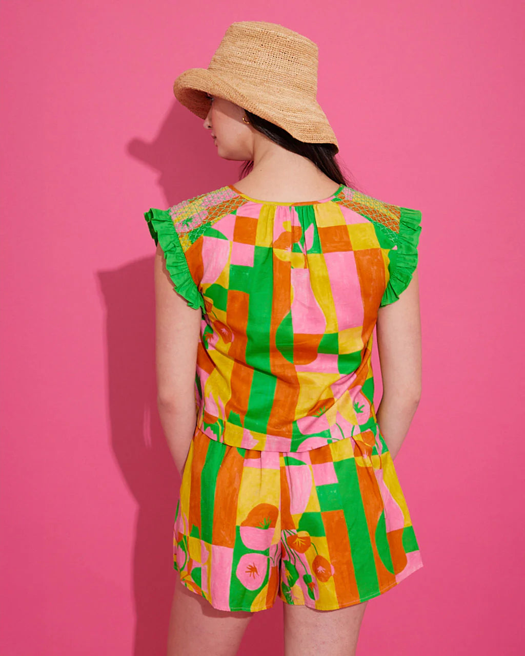 The Gigi top is back in our new Grasse print! It features a cap sleeve with smock detailing, a v-neckline, and a boxy fit for maximum comfort and cuteness! Pair with our James short in cabana for the full look.