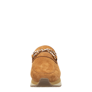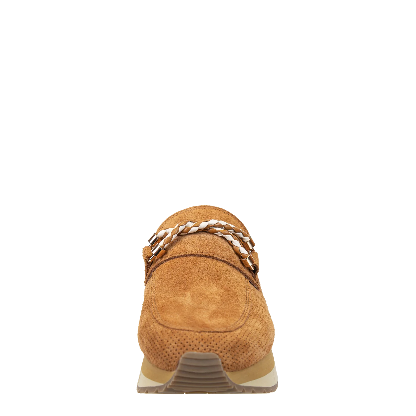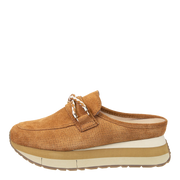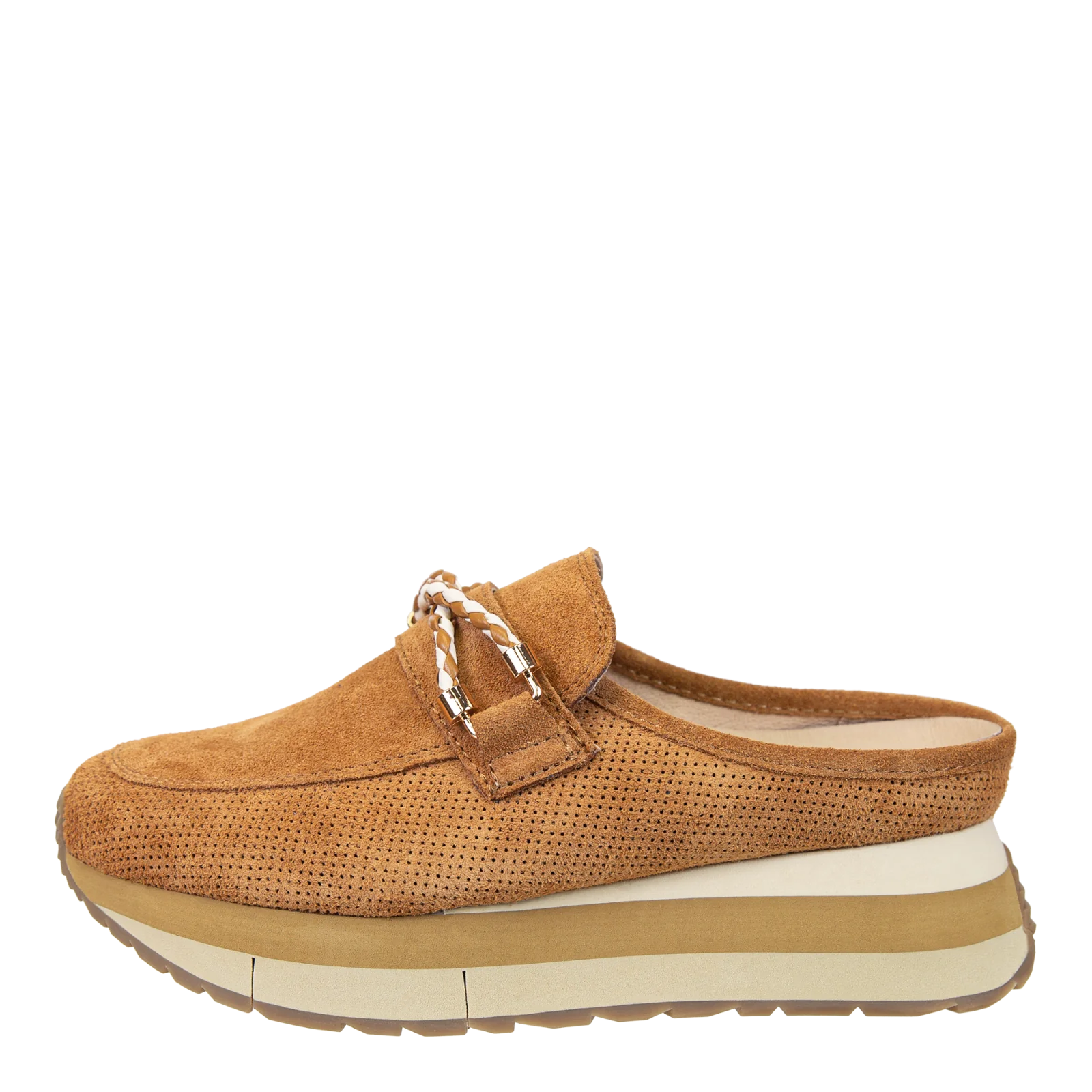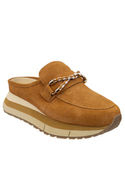 Some say platform mule. Some say slip-on sneaker. Others say, they don't care they just have to have them. Step into summer prep in these camel colored, slip-on sneaker loafers with a subtle nautical vibe. Polo is a fresh, sporty sneaker hybrid style featuring perforated suede, an interlocked infinity cord detail, and a lightweight layered platform that's designed to slip on and walk the boardwalk in elevated coastal style. Pair with your favorite trousers and tops for a go-to look of effortless sophistication. Yacht not included.
