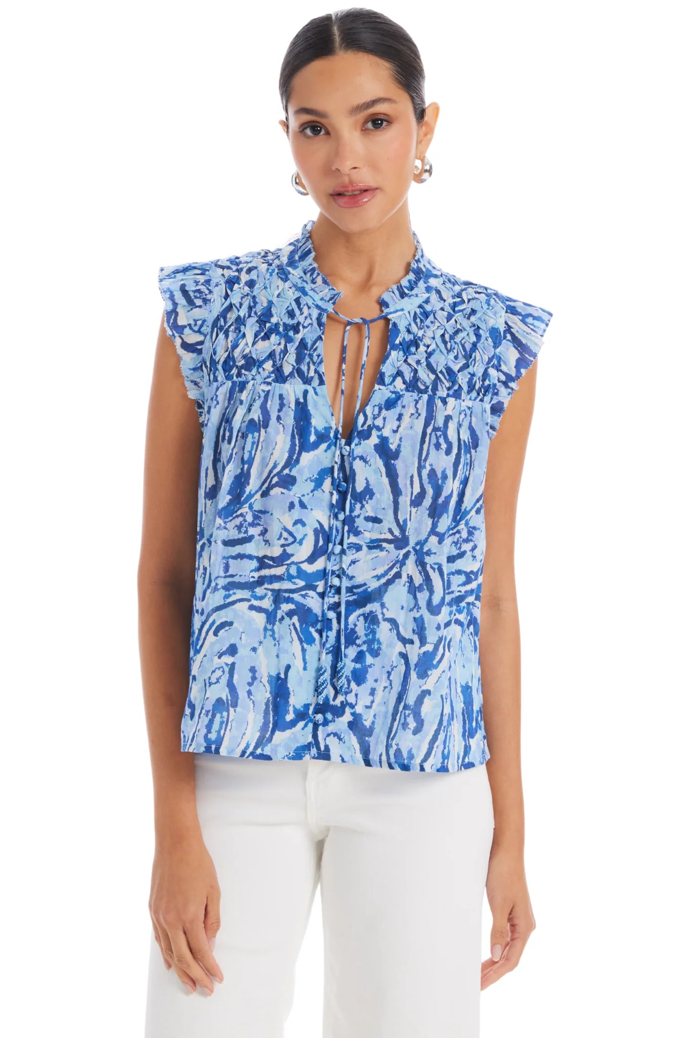 A true Classic: The Mckay Top features an intricate honeycomb smocking detail at the yoke. The ruffled neckline ends in a split V shape with beaded ties. A ruffled shoulder is finished with a delicate picot edge. Featuring buttons down the center front of this loose and flowy blouse.
