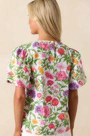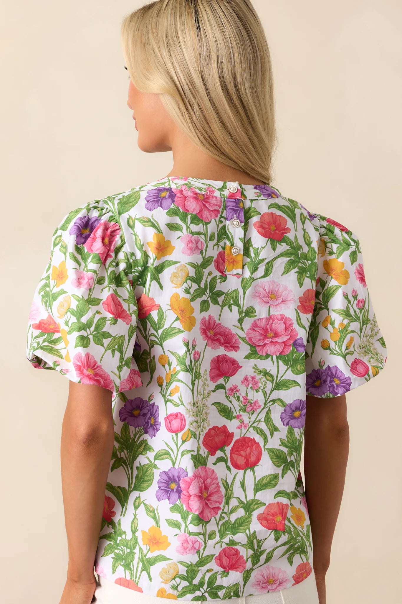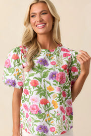 The Lane Secret Garden Top is a floral dream, effortlessly blending charm and elegance. With its delicate garden-inspired print and flattering fit, this top is perfect for adding a touch of romance to your everyday look. Dress it up or down—it's a versatile piece you'll love to wear. This top features a multicolor floral design, a round neckline, a back keyhole closure, and short puff sleeves with elastic cuffs.