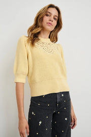 The Steph blends blouse, sweater, and tee for the ultimate transitional top in a cotton knit fabrication. It features a crew body with crochet at the neckline, and has a mid-weight feel that works year-round.