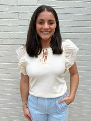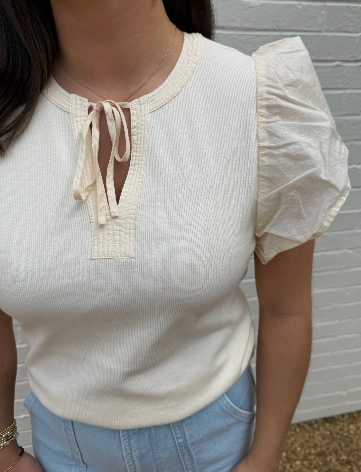 Melissa Nepton: rubbed v neck tee with poplin ruffle sleeve detail