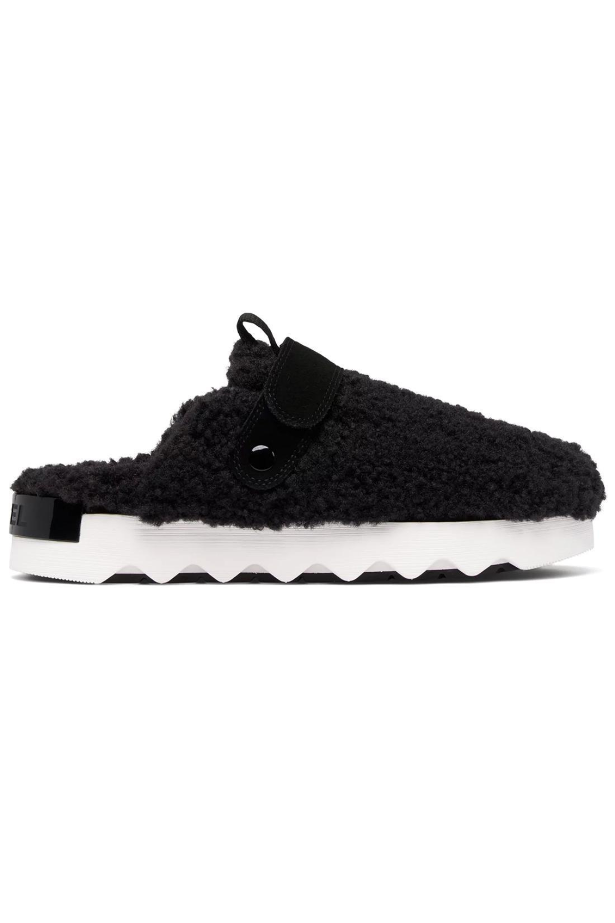 • UPPER: Faux shearling upper. Adjustable webbing strap across the midfoot. Webbing loop detail.