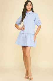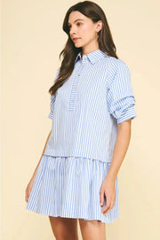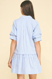 The Tiffany Dress features a unique layered construction with a collared, half-button placket top that flows into a playful ruffled hemline for extra movement. With its breezy vertical stripes and relaxed three-quarter sleeves, it's a fun, effortless choice for everything from seaside strolls to weekend coffee runs.