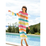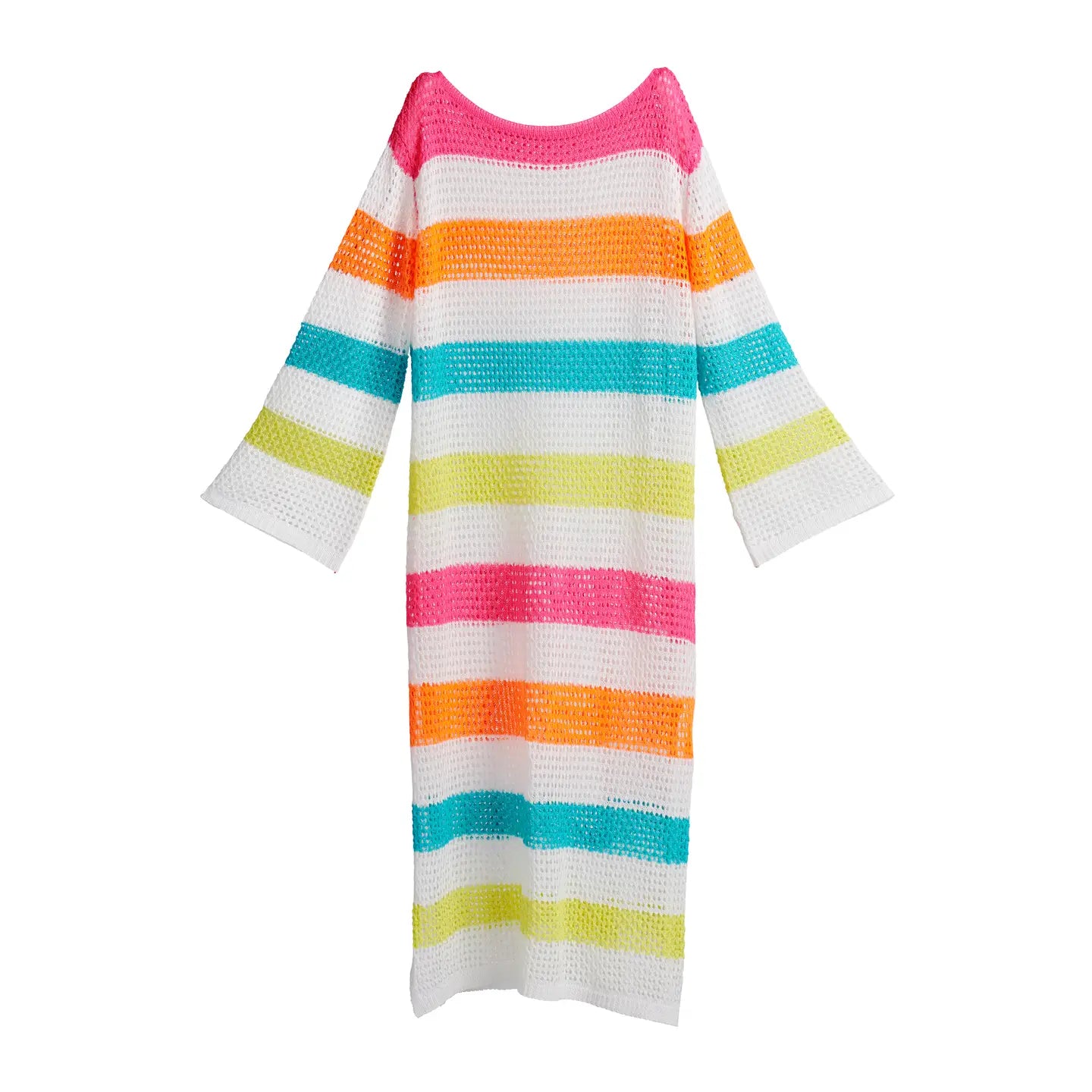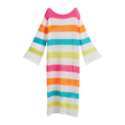 acrylic; hand wash, flat dry. Turn up the vibrance with the Verena Long Cover-Up! This breezy, lightweight knit features a kaleidoscope of bold, cheerful stripes in pink, orange, yellow, and turquoise. With its relaxed silhouette, flared sleeves, and airy open-weave design, it’s perfect for sunny poolside lounging or a breezy beach stroll. This cover-up offers effortless style and just the right coverage to keep you feeling cool and chic all day long.